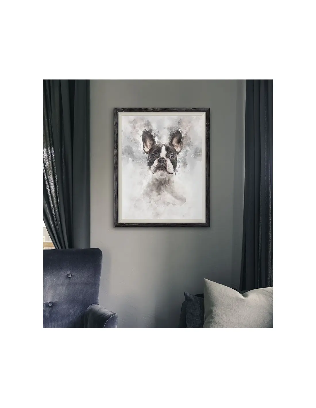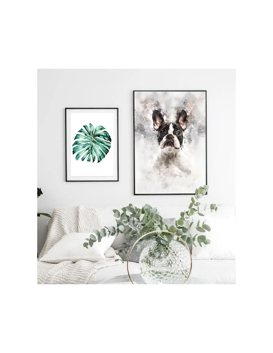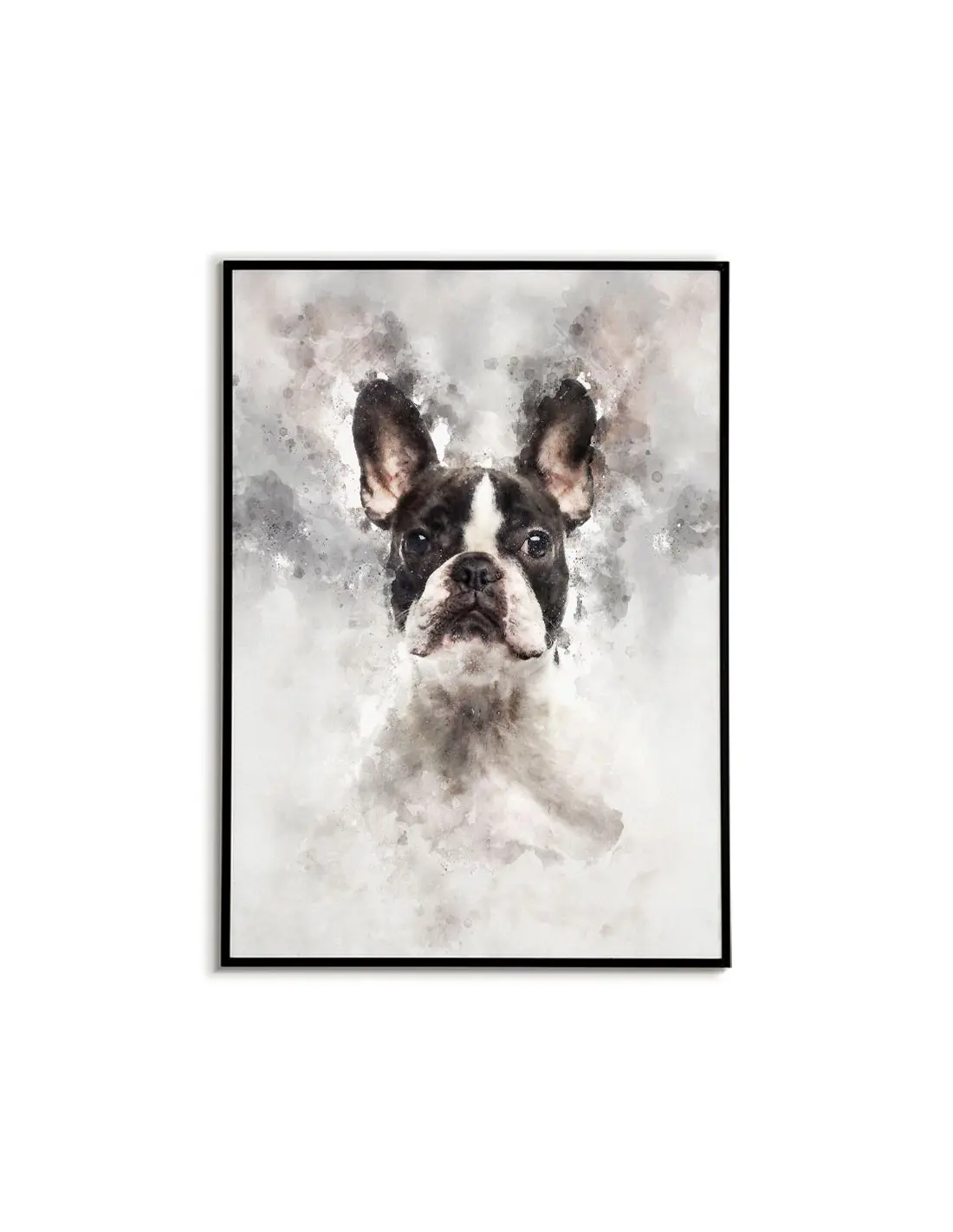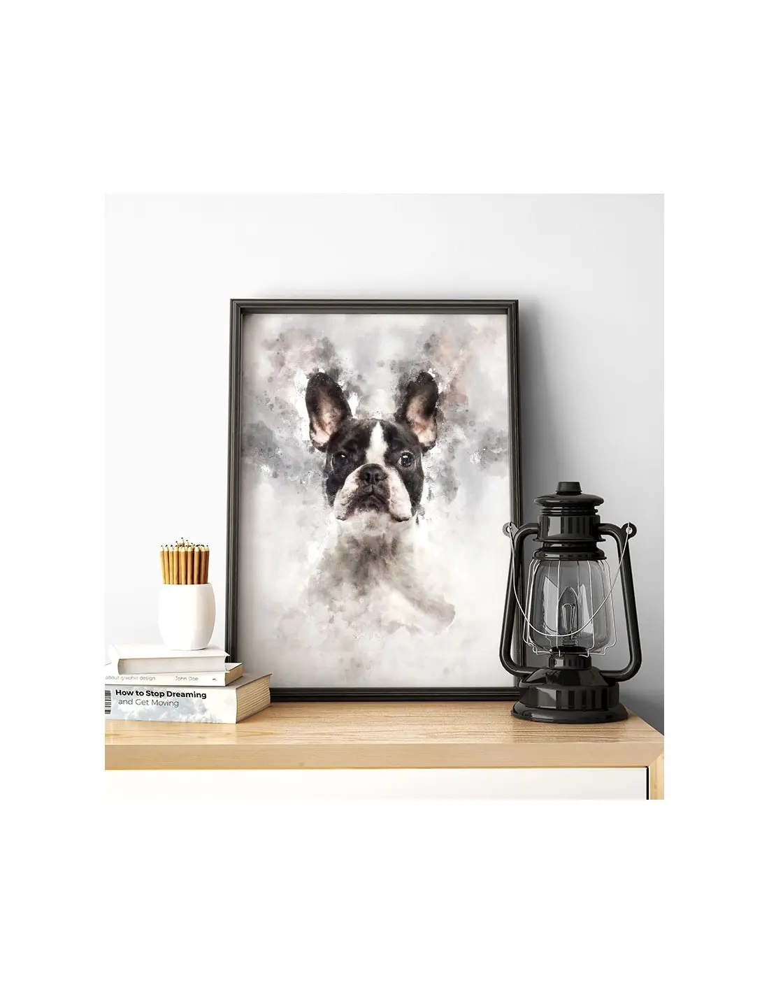 A poster made in watercolor, depicts a portrait of a sweet French Bulldog. Perfect for a dog admirer of this genre, but not only.