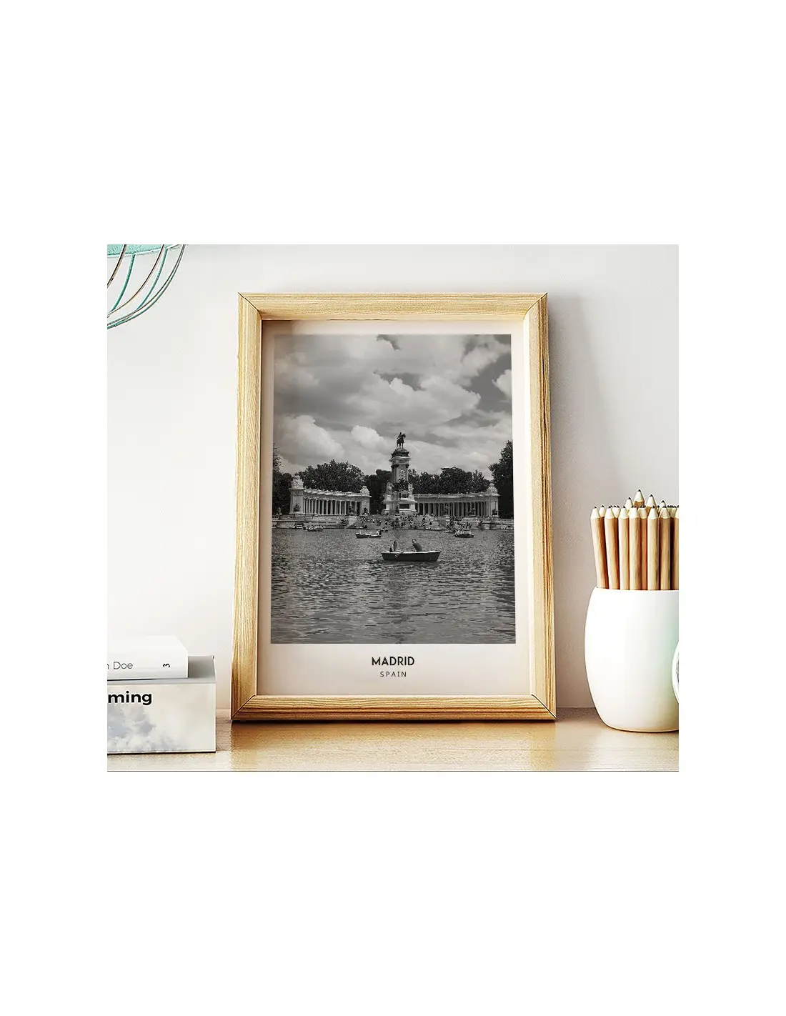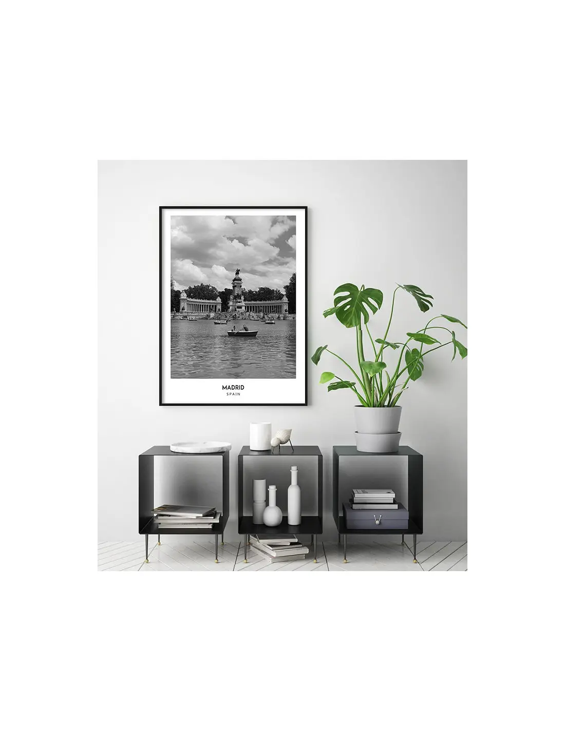 Beautiful graphics on the wall with a photo of Madrid city in Spain. The graphic shows a beautiful shot of the city made in black and white. The poster also has an inscription with the name of the city in English.