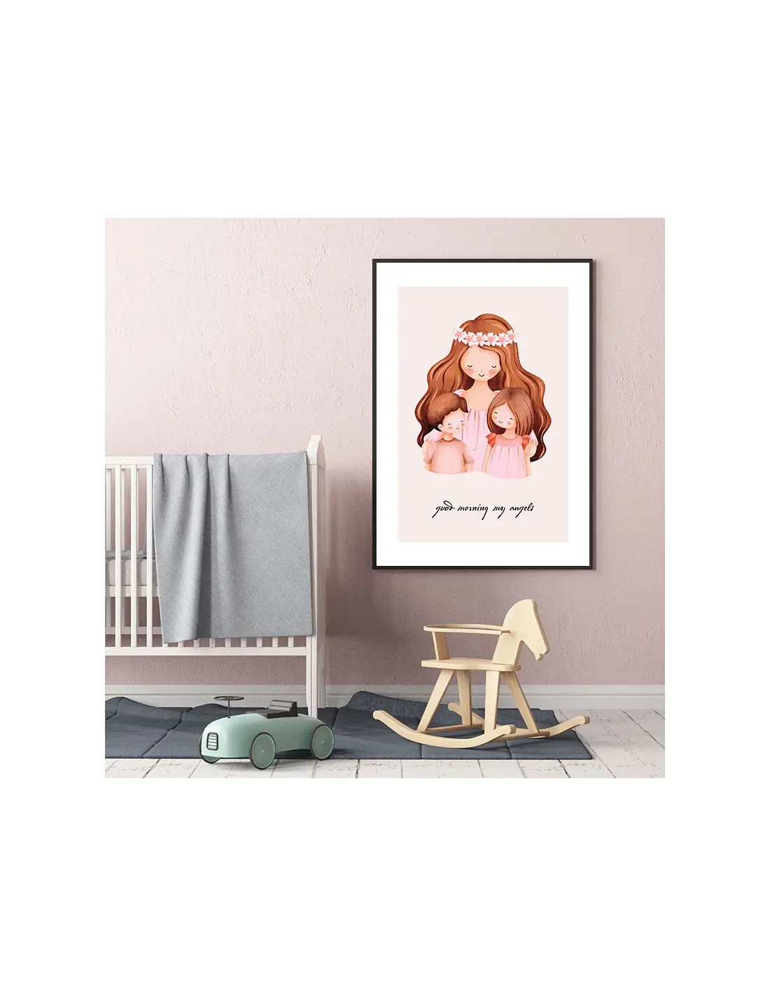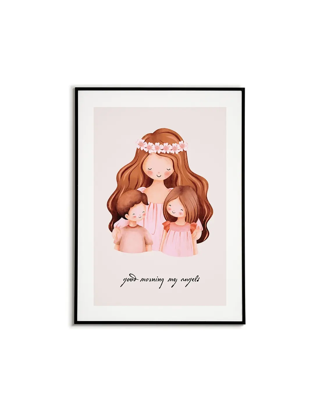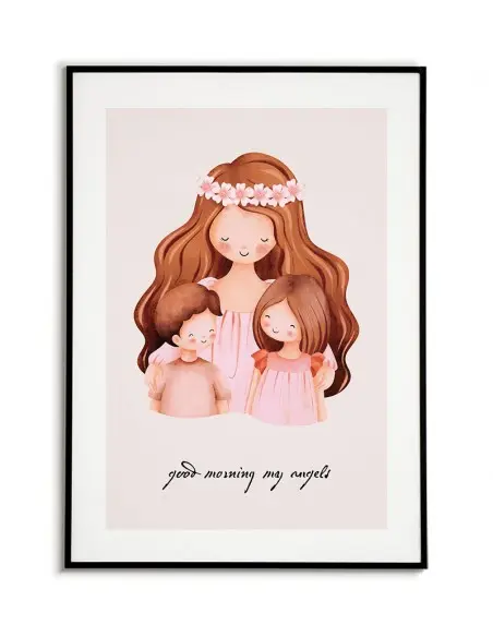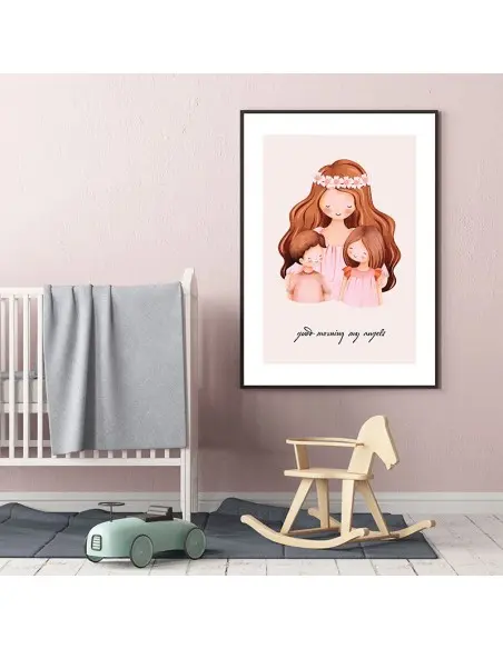 A poster for a children's room A drawing with mother and children and the words "Good morning my angels". A poster for a child's room with a drawing of a hugging mother.