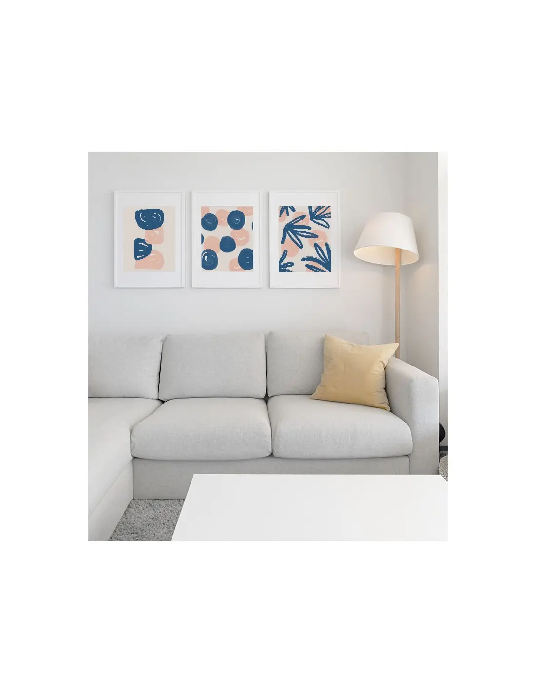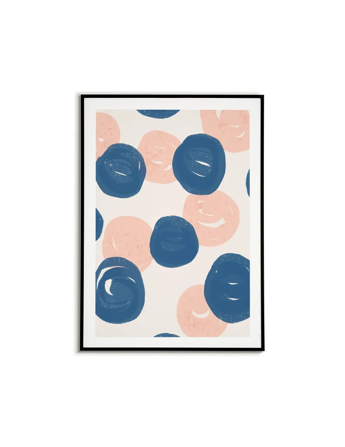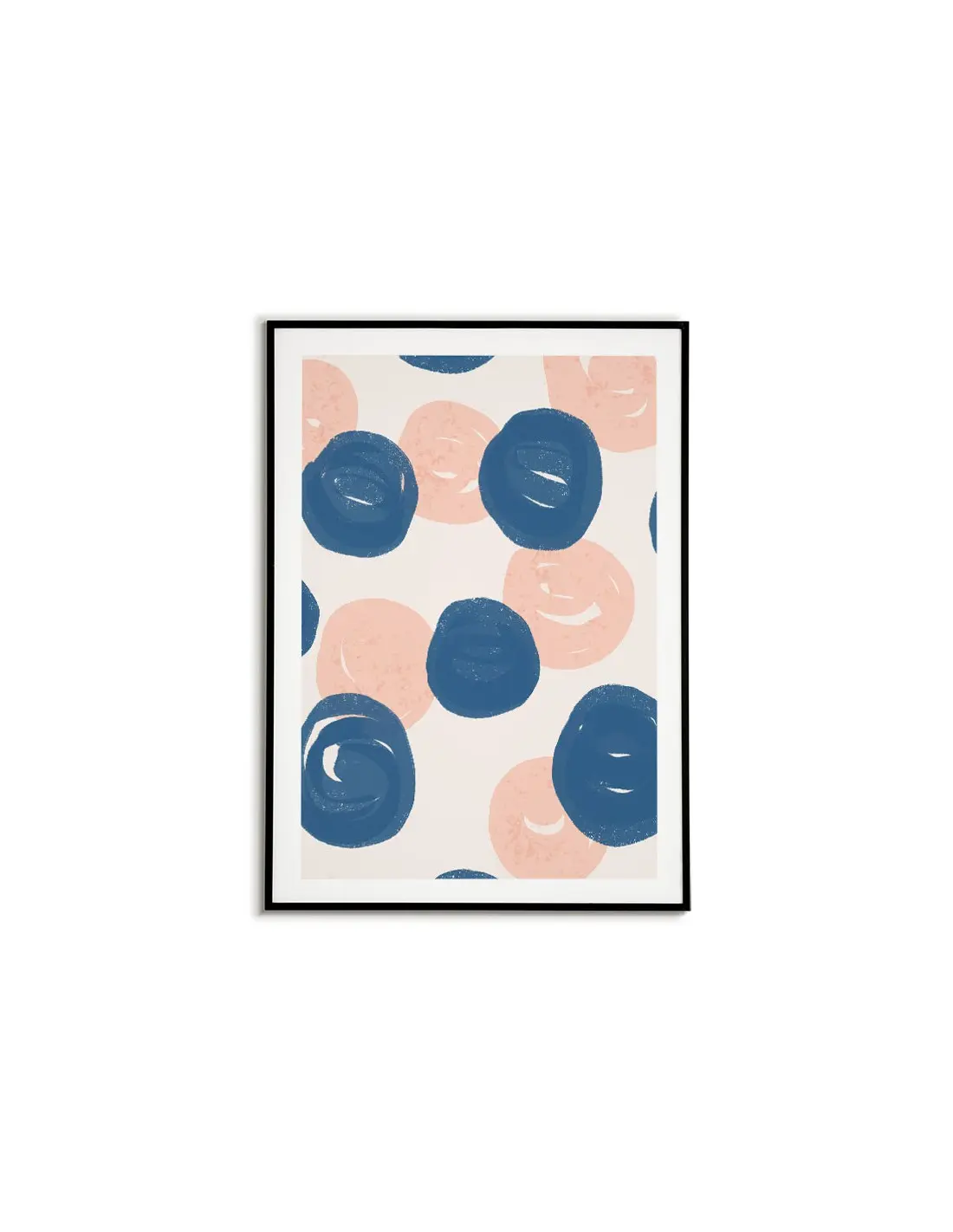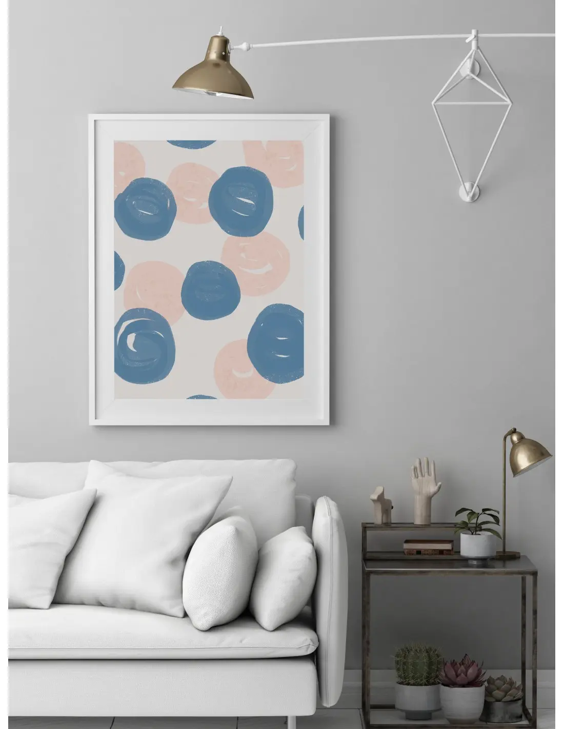 Plakat skandynawski - Abstrakcje farbą to piękna i nowoczesna grafika na ścianę, która pięknie wypełni przestrzeń swoją prostotą i ślicznymi ciepłymi odcieniami. Wzór z niebieskimi i różowymi kulkami.