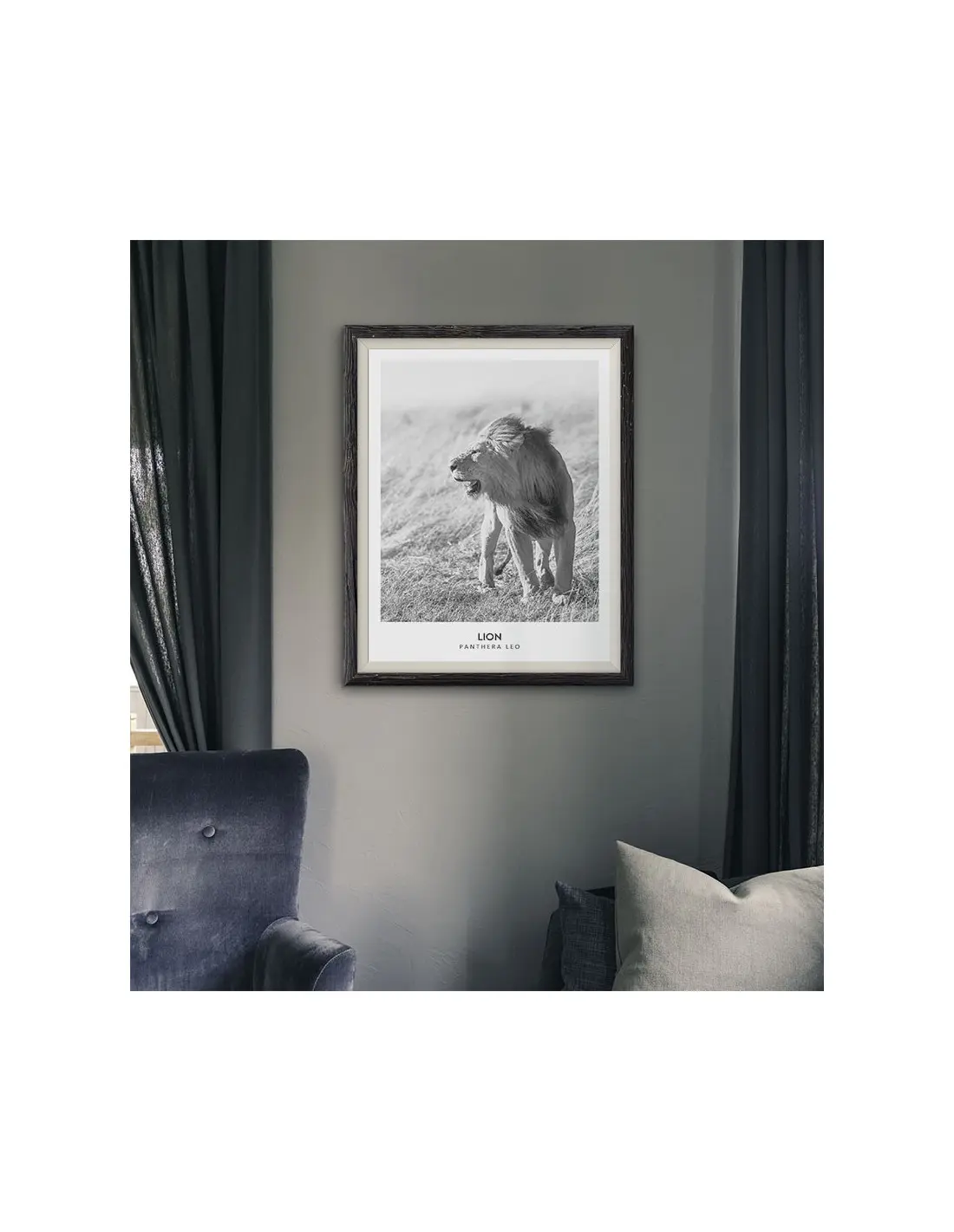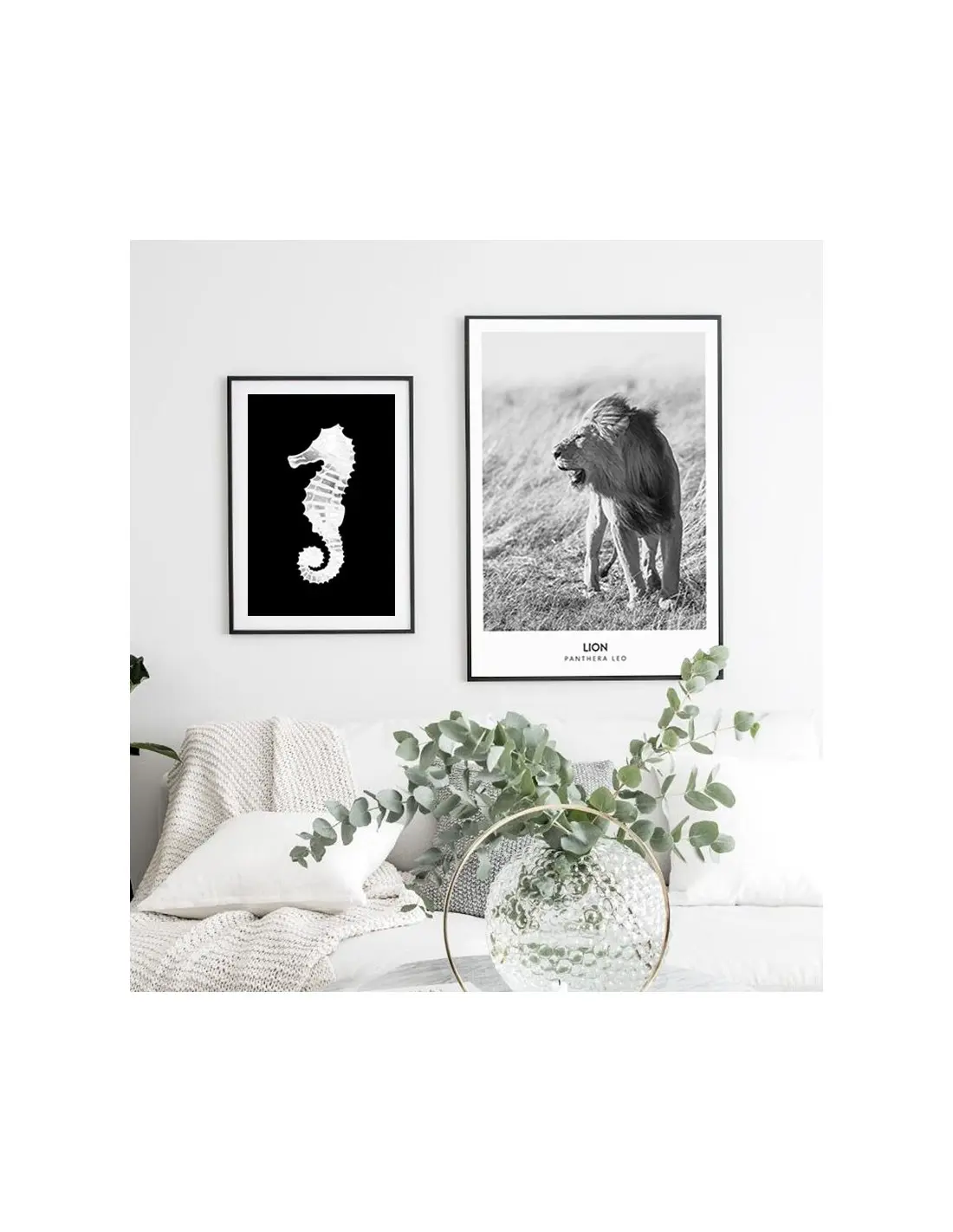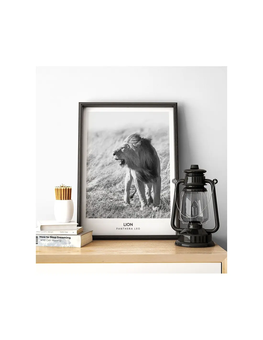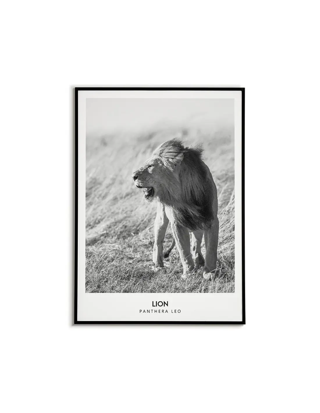 Nowoczesny plakat wykonany w stylu skandynawskim i białą ramką. Na plakacie znajduje się zdjęcie lwa wykonane w czerni i bieli oraz jego nazwa w języku Angielskim, oraz Łacińskim.